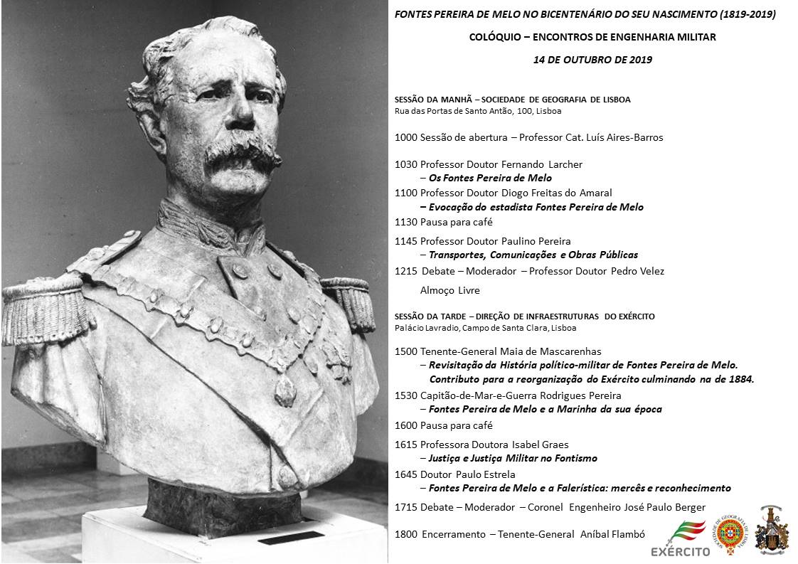 Colóquio Fontes Pereira de Melo no Bicentenário do seu Nascimento (1819-2019) promovido pelas Comissão Infante D. Henrique, Ordem de Cristo e Expansão e Secção de Transportes, da SGL e pela Direcção de Infraestruturas do Exército, no âmbito dos “Encontros de História Militar”, que se realizará no dia 14 de Outubro de 2019,durante a manhã, das 10.00 às 13.00h, na Sociedade de Geografia, no Auditório Adriano Moreira, e durante a tarde, das 15.00 às 18.00h, na Direcção de Infraestruturas do Exército, no Palácio Lavradio, no Campo de Santa Clara.